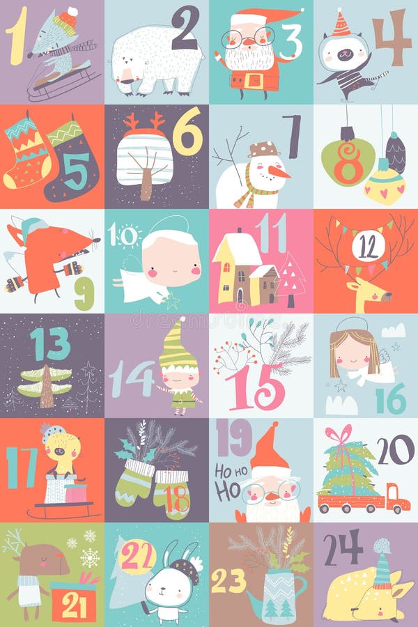 Advent Calendar with Christmas Decoration and Characters Stock Vector