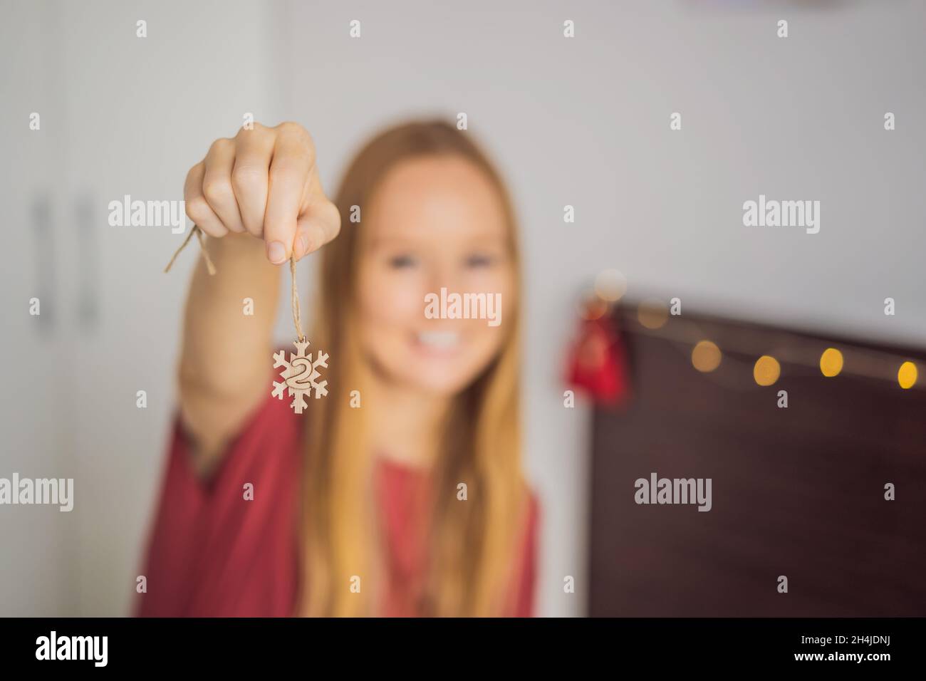 Woman making Christmas advent calendar Pouches on a rope Stock Photo