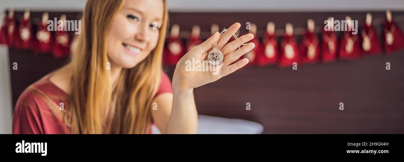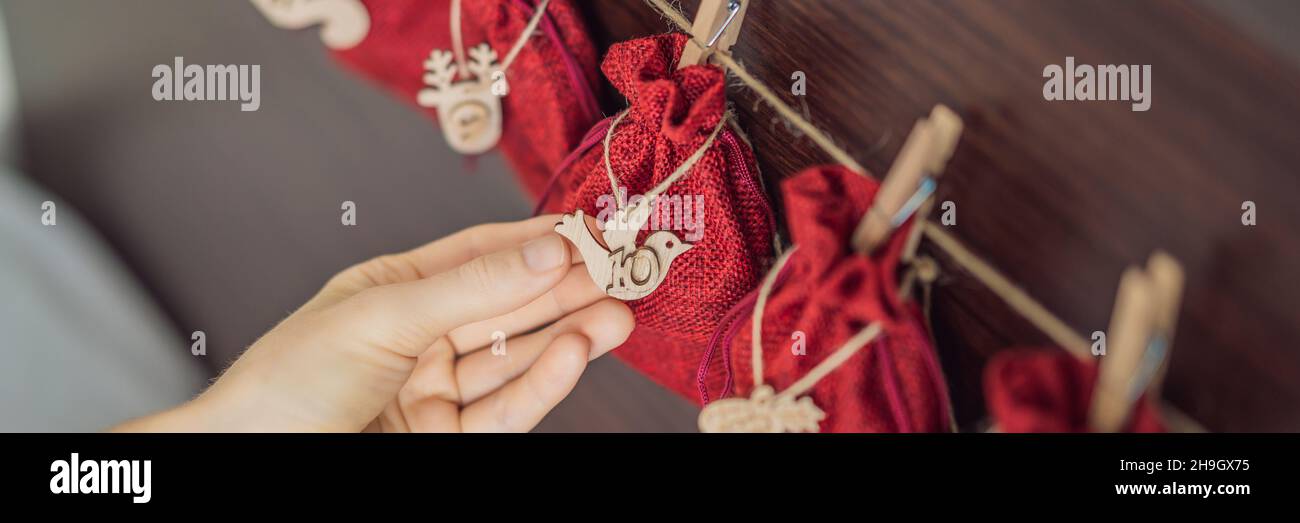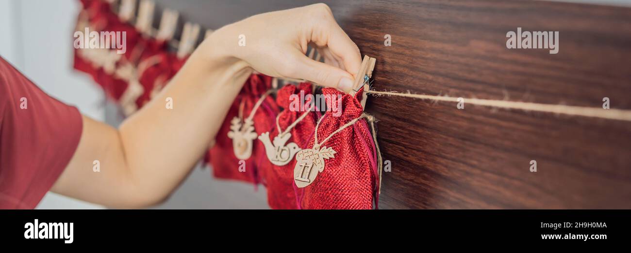 Woman making Christmas advent calendar Pouches on a rope BANNER LONG