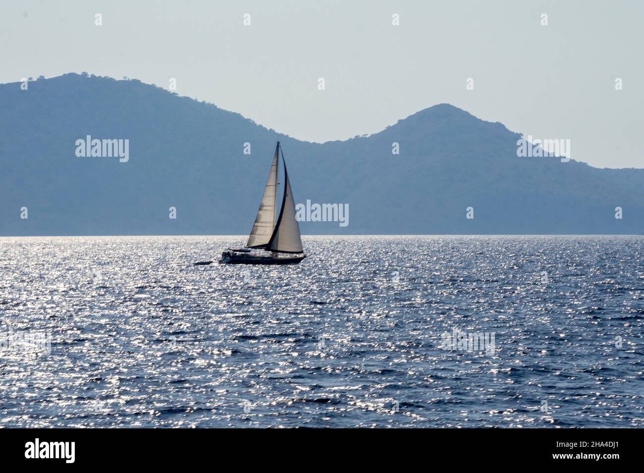 White boat sailing close to the coast blue aegean sea in Greece Stock