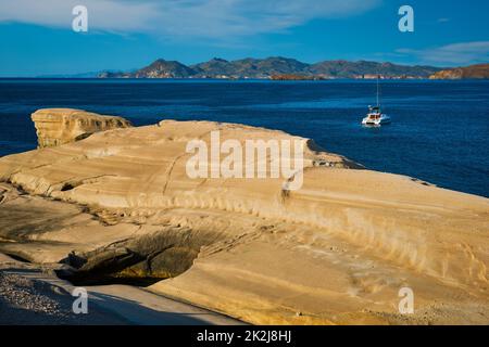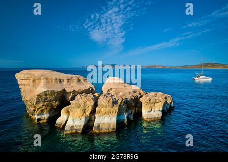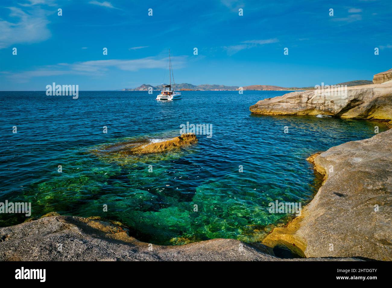 Yacht boat at Sarakiniko Beach in Aegean sea Milos island Greece