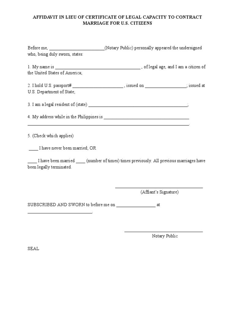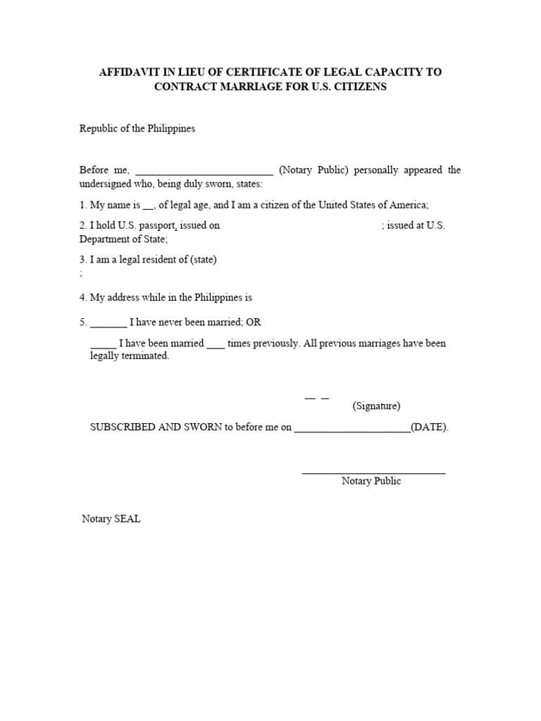 Affidavit in Lieu of Certificate of Legal Capacity To Contract Marriage