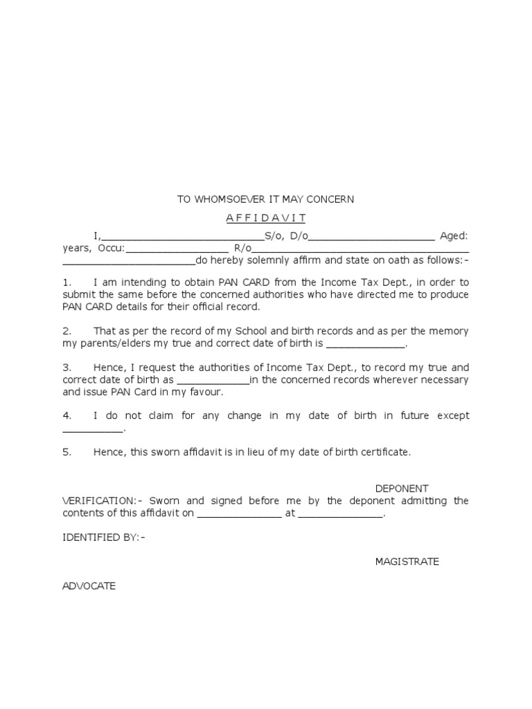 Affidavit in Lieu of Date of Birth Certificate For Obtaining PAN Card PDF