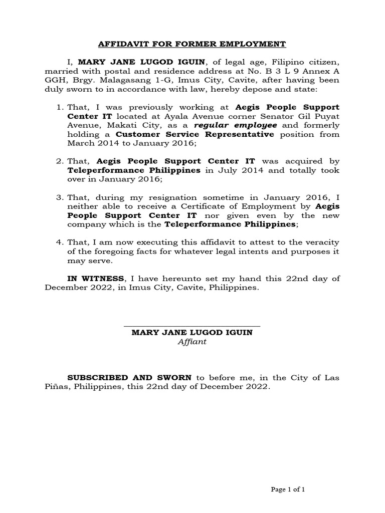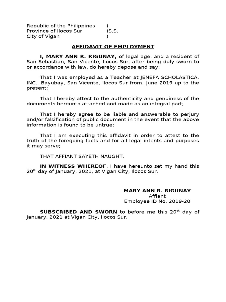 Certificate of Employment Sample PDF Affidavit Document