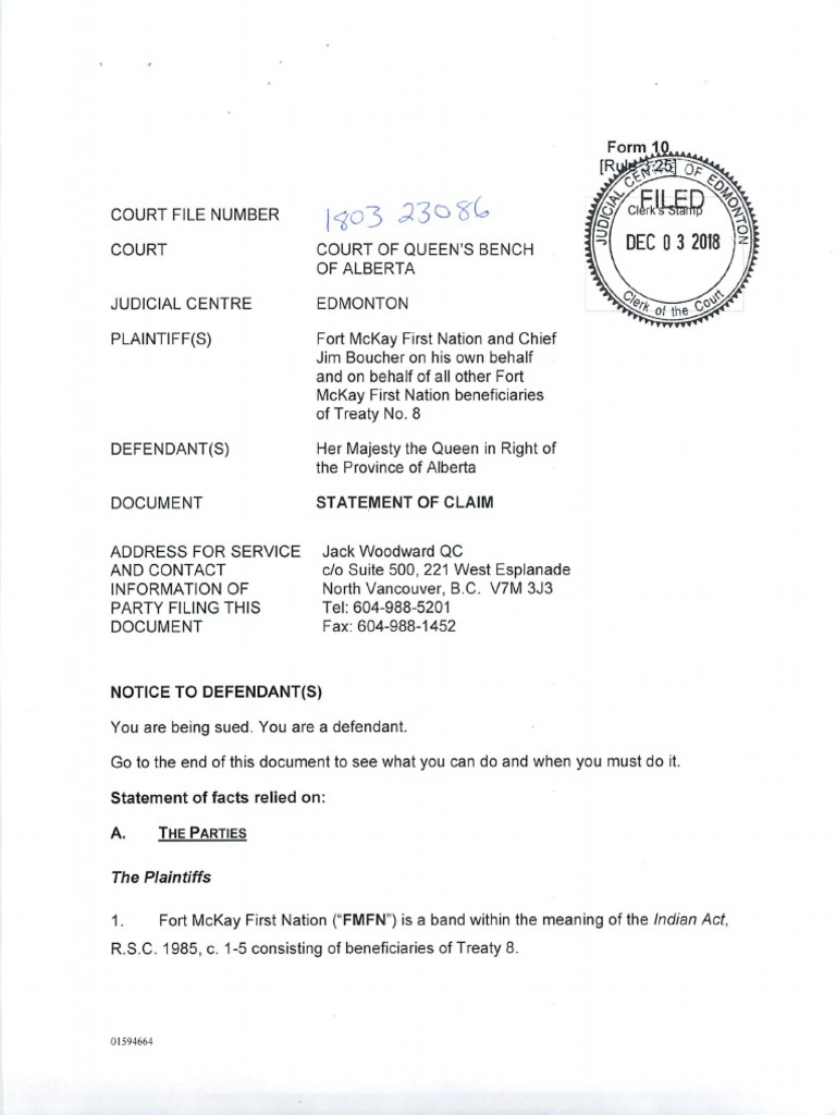 2018 12 03 Statement of Claim Fort McKay First Nation PDF