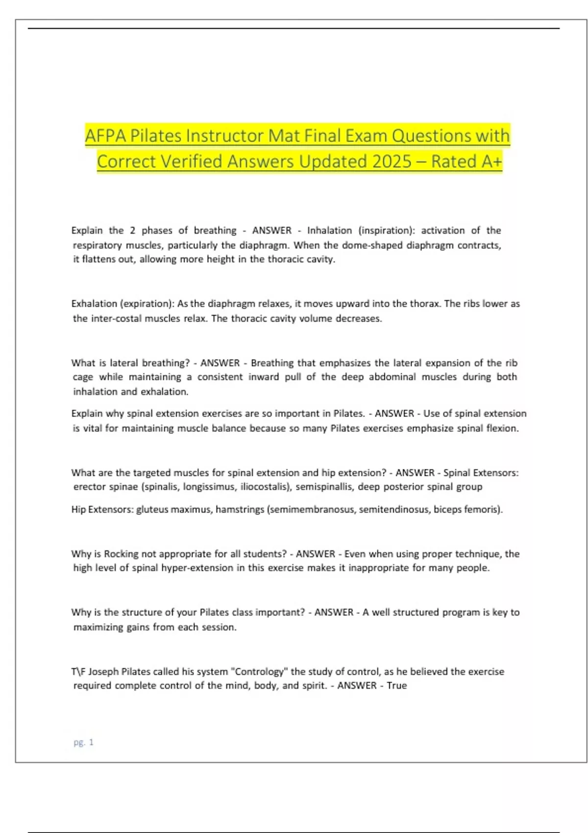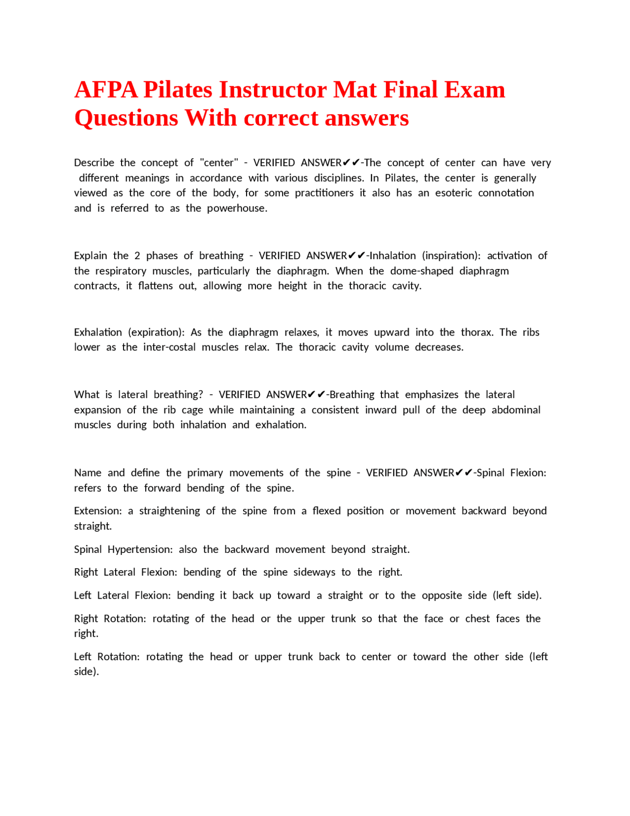 AFPA Pilates Instructor Mat Final Exam WITH CORRECT ANSWERS Exams