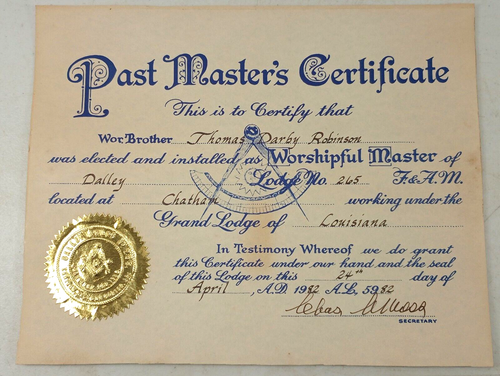 Masonic Lodge Past Masters Certificate Of Louisiana 1982 eBay