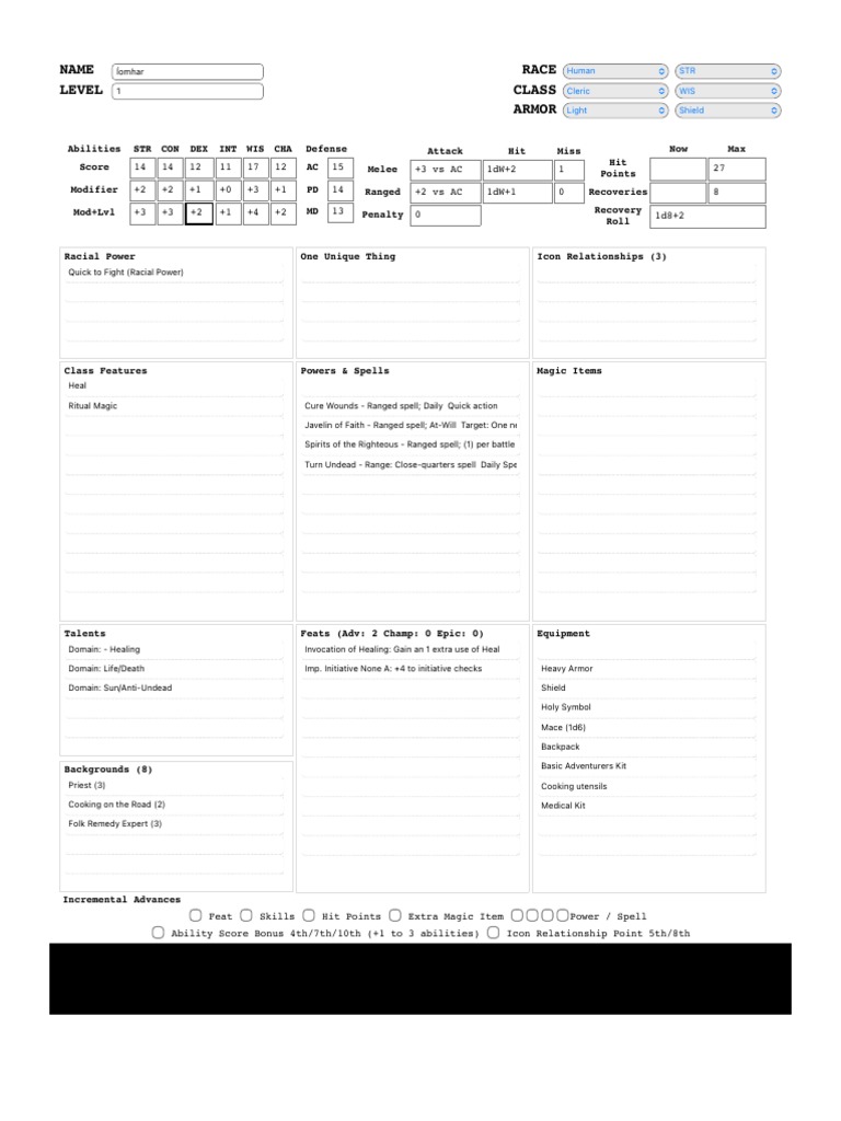 Íomhar 1st Level Cleric 13th Age Character Sheet PDF Gary Gygax