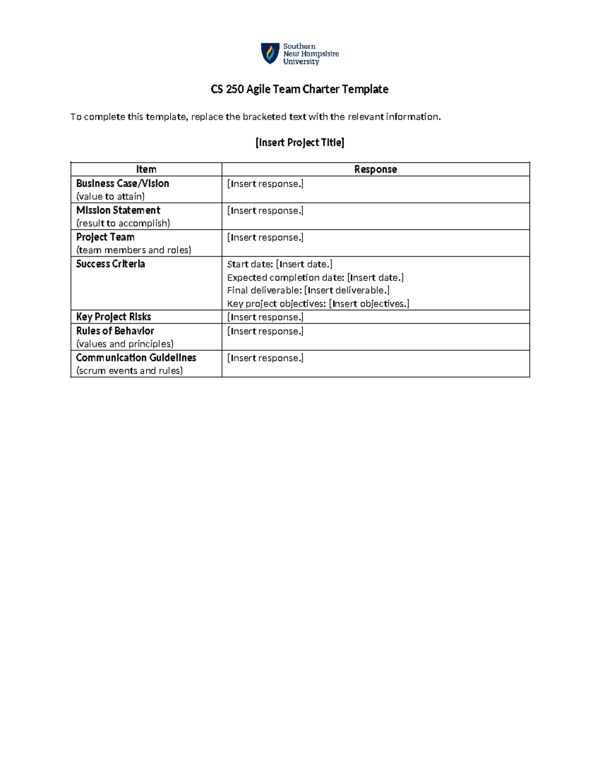 CS 250 Agile Team Charter Template Insert Project Title Item