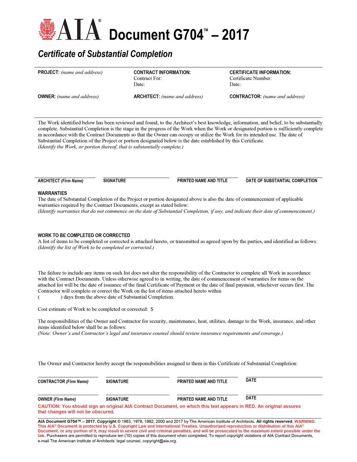 Certification of Substantial Completion (AIA G704) Architect Copyright