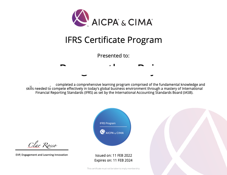 Completed IFRS Certificate Program from AICPA CIMA Vishnu Varthanan