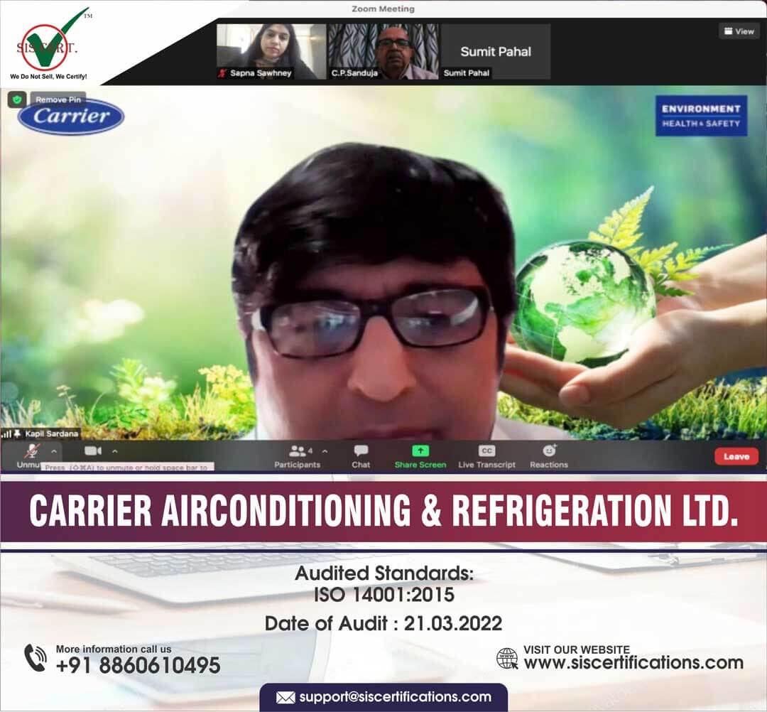 ISO 14001:2015 certificate to Carrier Air conditioning Refrigeration