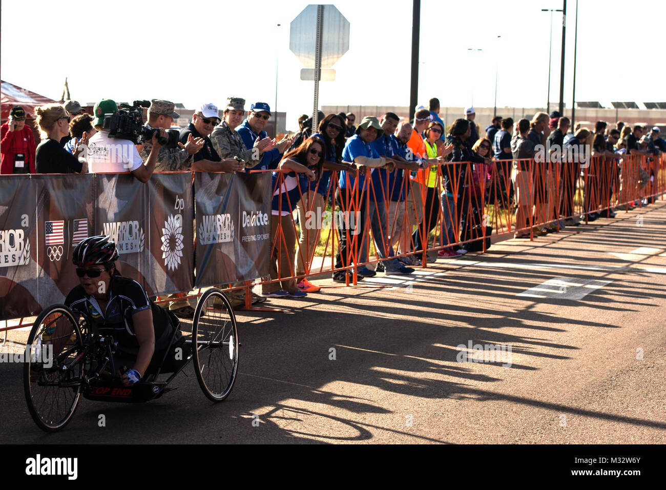 Air Force athlete Sarah Evans finishes a mixed cycling race during the