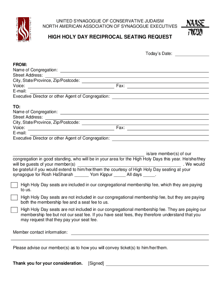 Fillable Online High Holiday Seating Request Form United Synagogue of