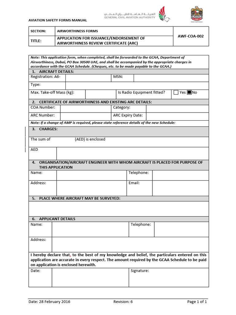 Awf Coa 002 Application For Issuance Endorsement of Airworthiness