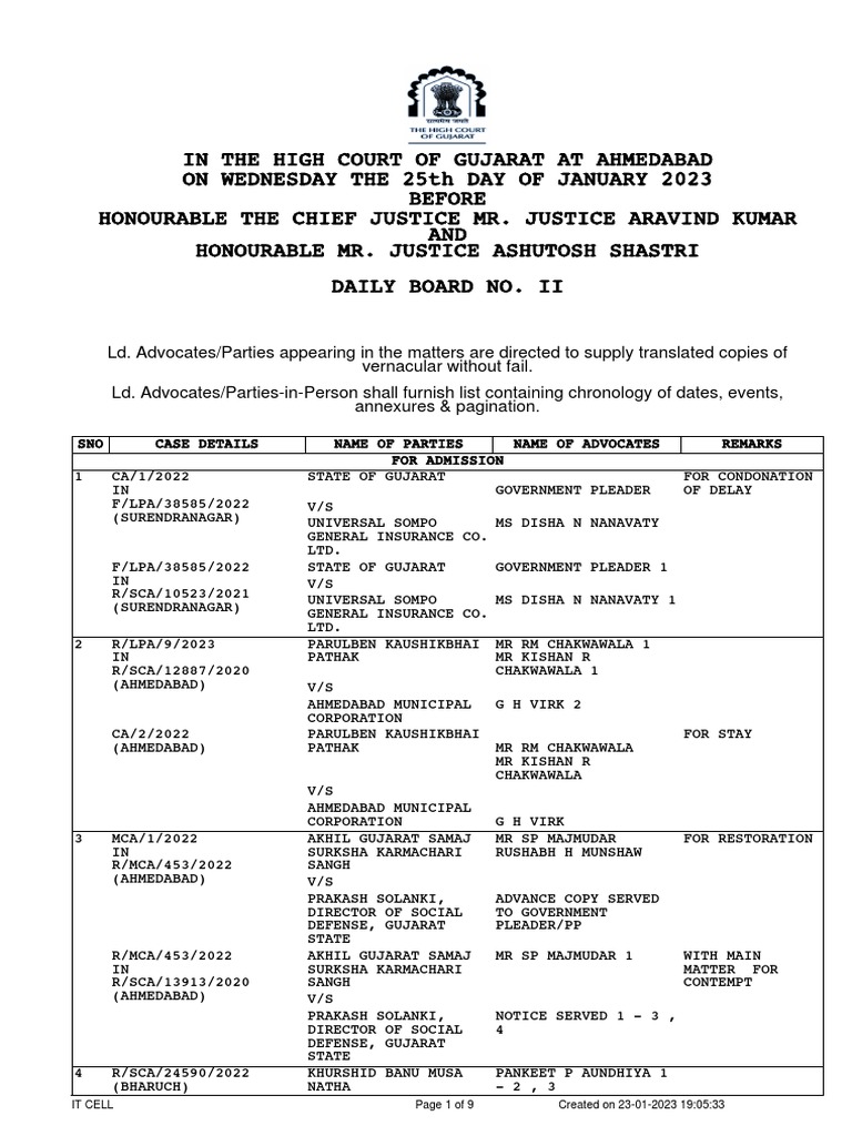 Causelist Court AK CJ AJS J 25th January 2023 PDF Gujarat