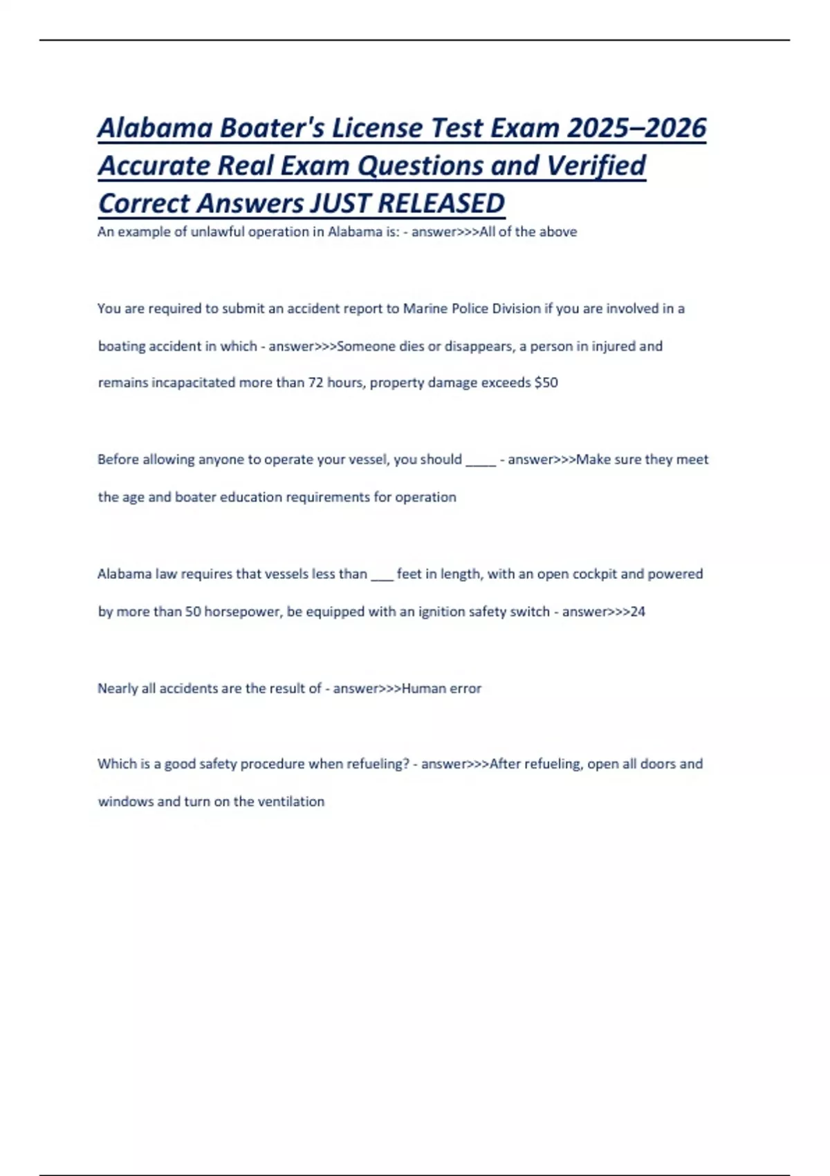Alabama Boater #39 s License Test Exam 2025 2026 Accurate Real Exam