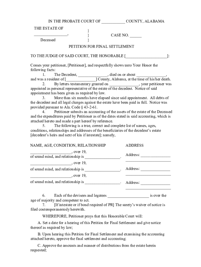 Fillable Online Alabama Petition for Consent Settlement of Estate by