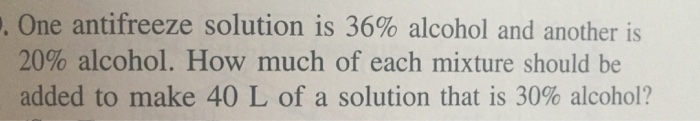 Solved One antifreeze solution is 36% alcohol and another is Chegg com