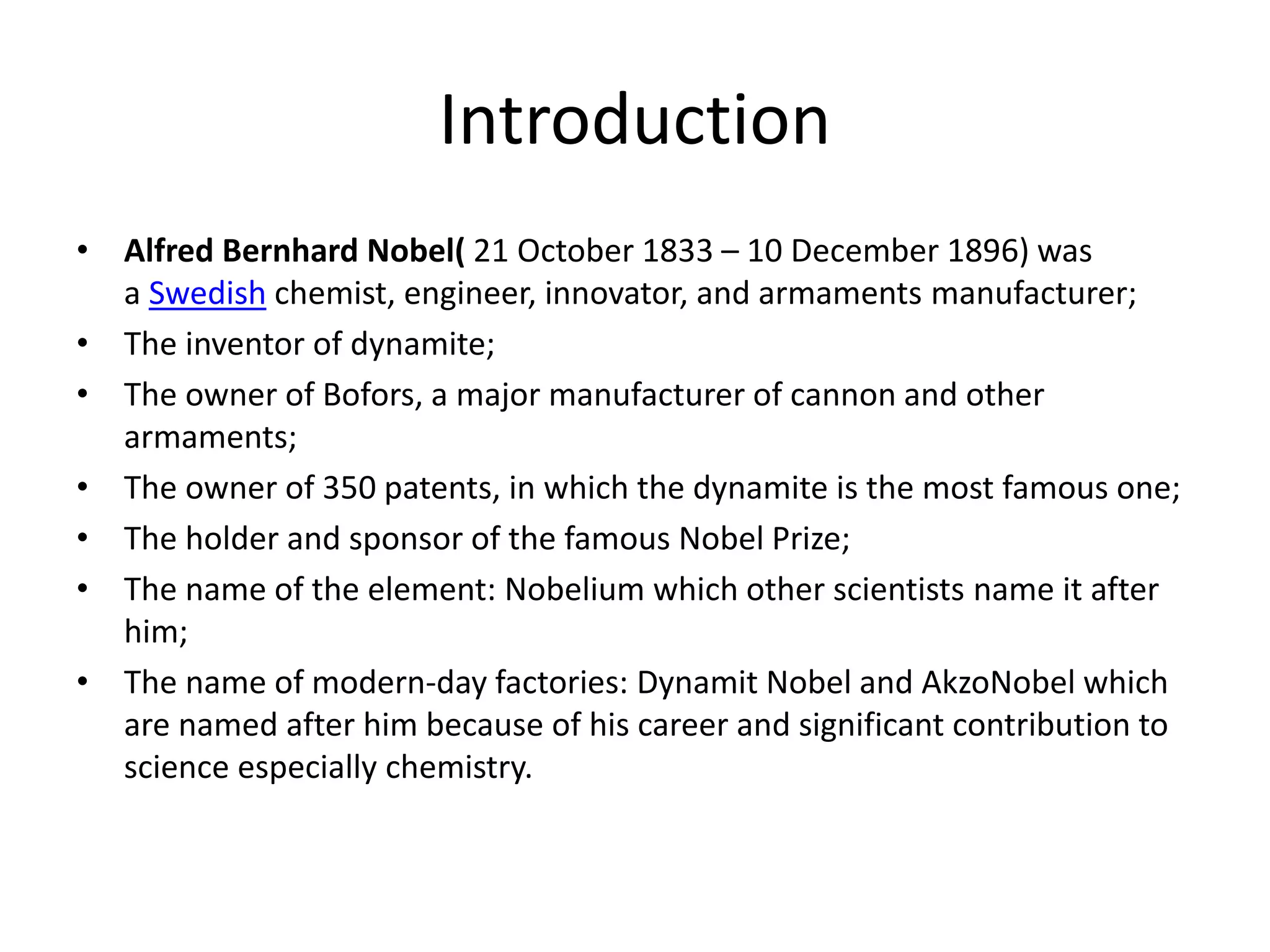 Alfred Berhard Nobel 1833 1896 Swedish chemist and engineer invented a