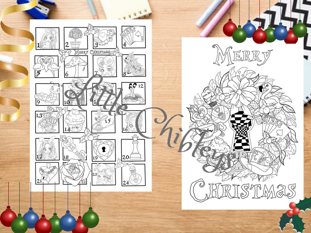 Christmas Alice Advent Calendar and Wonderland Wreath Colouring Pages