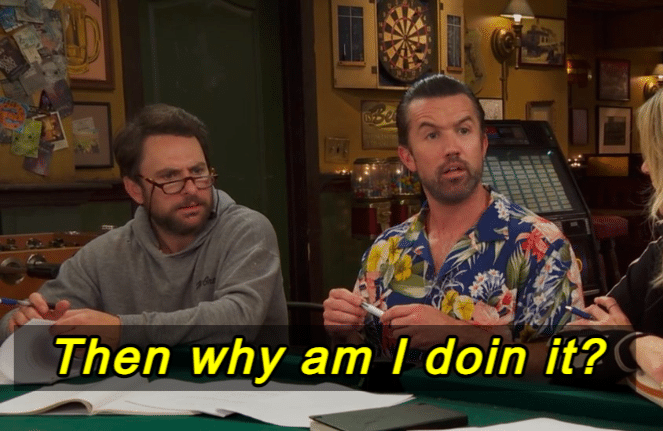 Then why am I doin it?: Always Sunny Mac Asking Doing Helping Rude