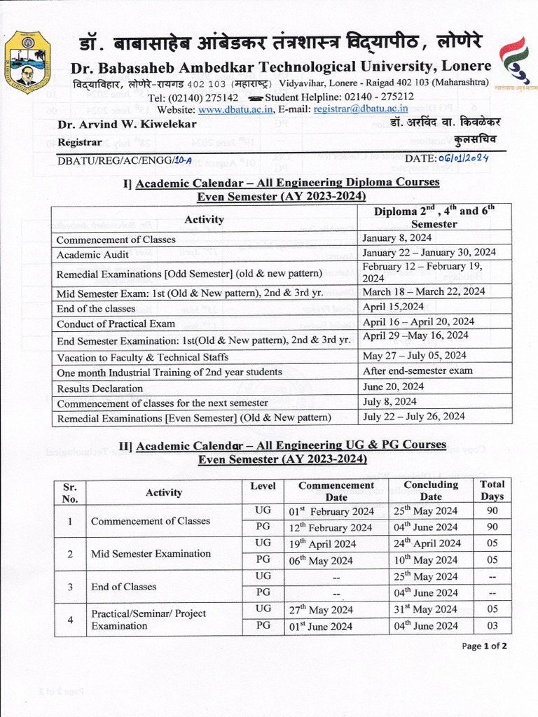 Academic Calender Dr A D SHINDE COLLEGE OF ENGINEERING