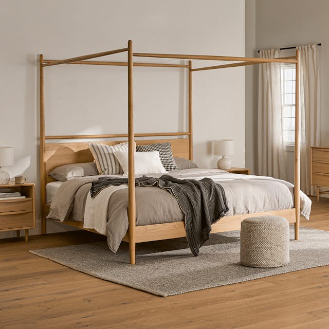 Lenia White Oak Wood Mid Century Inspired Queen Sized Canopy Bed Article