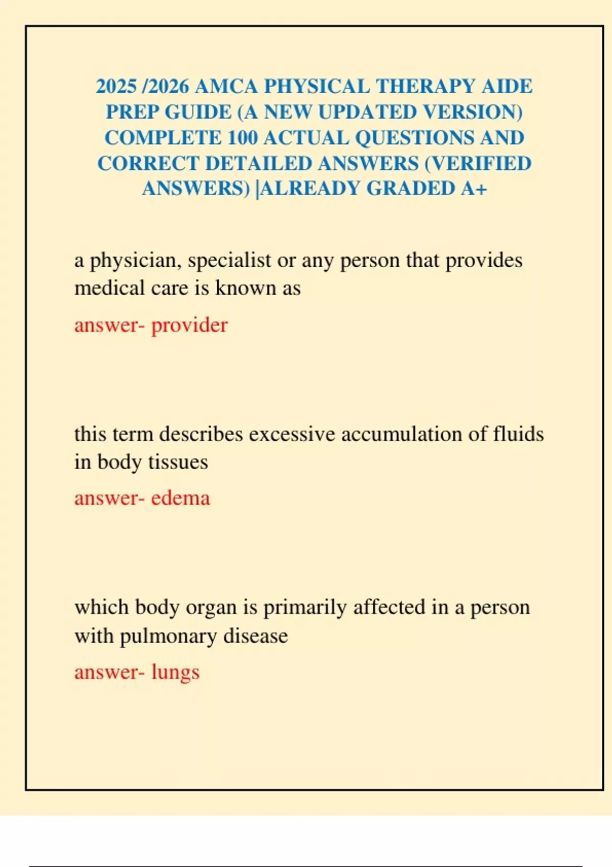AMCA PHYSICAL THERAPY AIDE EXAM 2024 2025 ACTUAL QUESTIONS AND CORRECT