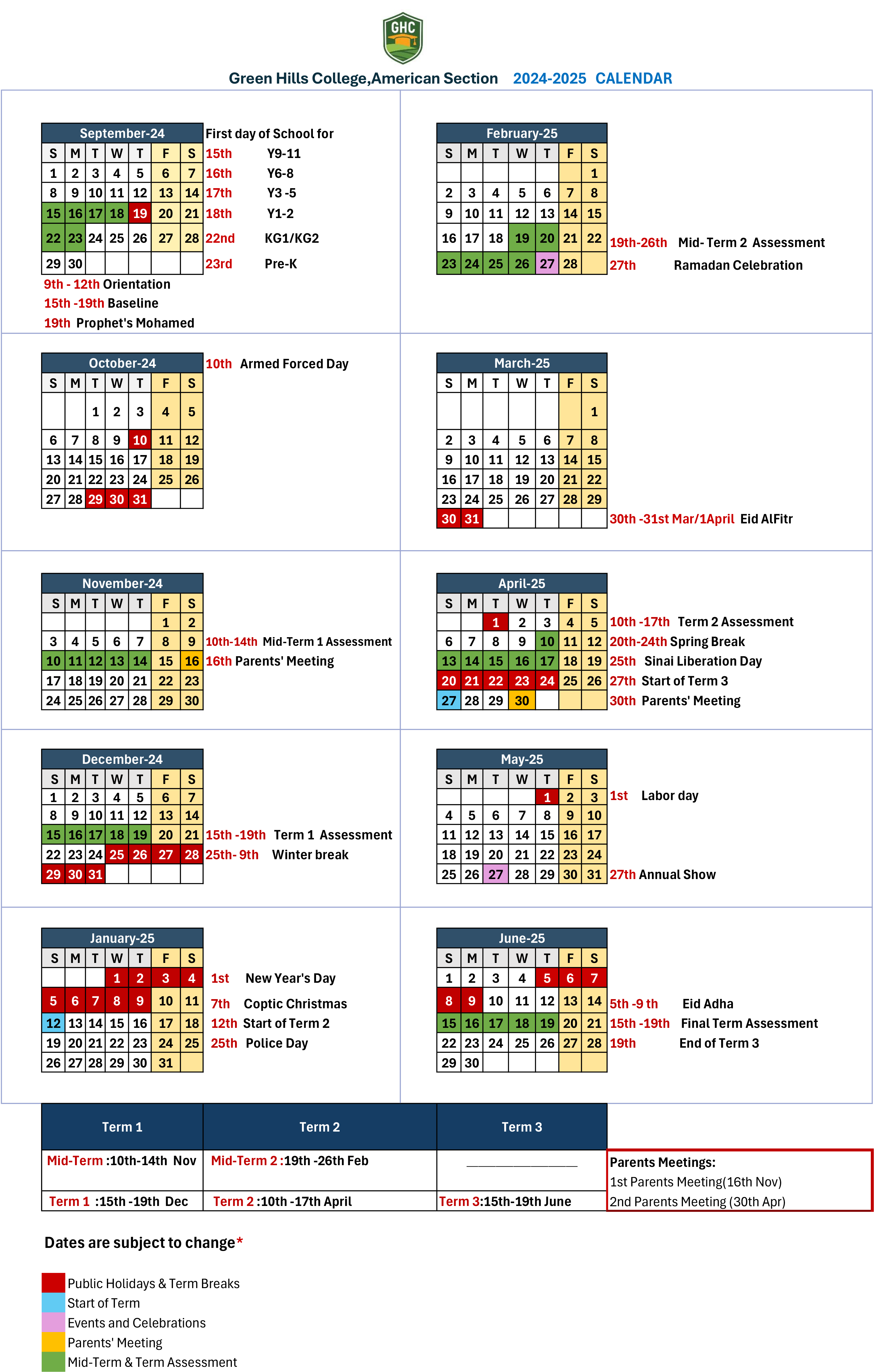 Calendar GHC Green Hills College