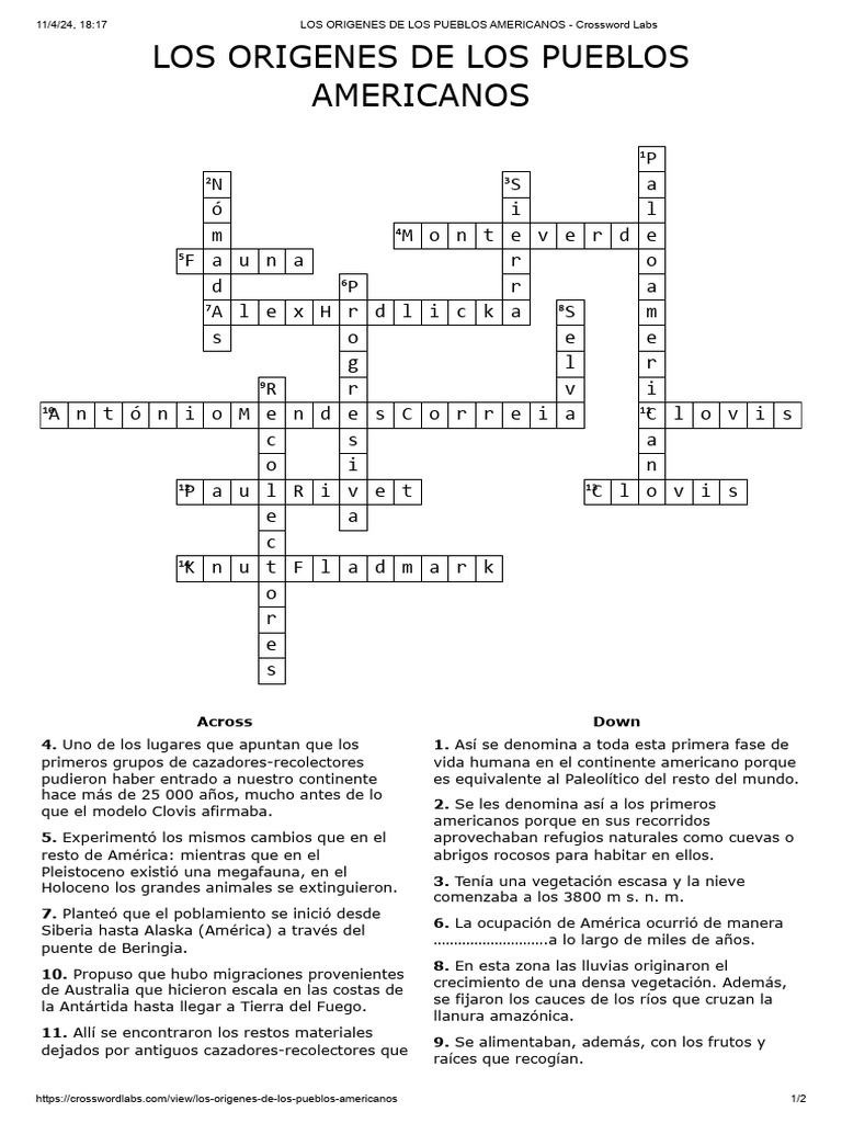LOS ORIGENES DE LOS PUEBLOS AMERICANOS Crossword Labs 1 PDF