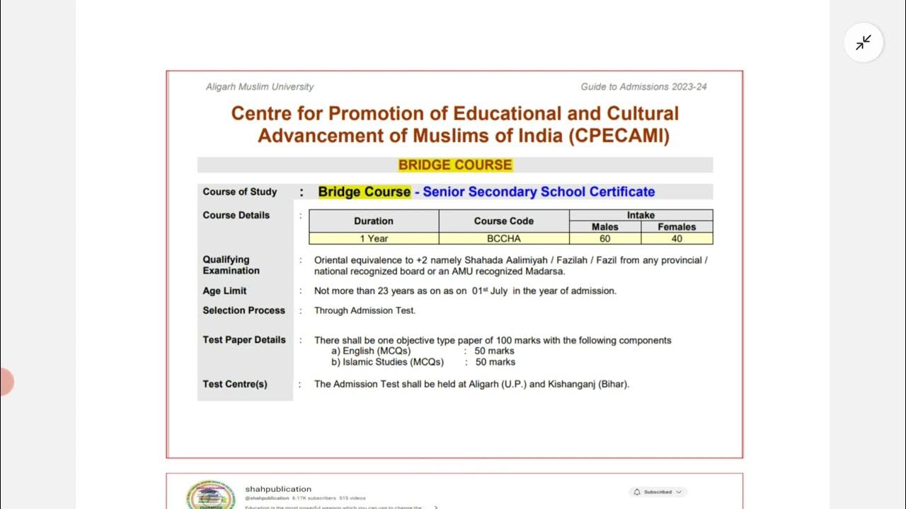 AMU Bridge Course Senior Secondary School Certificate l one year Class