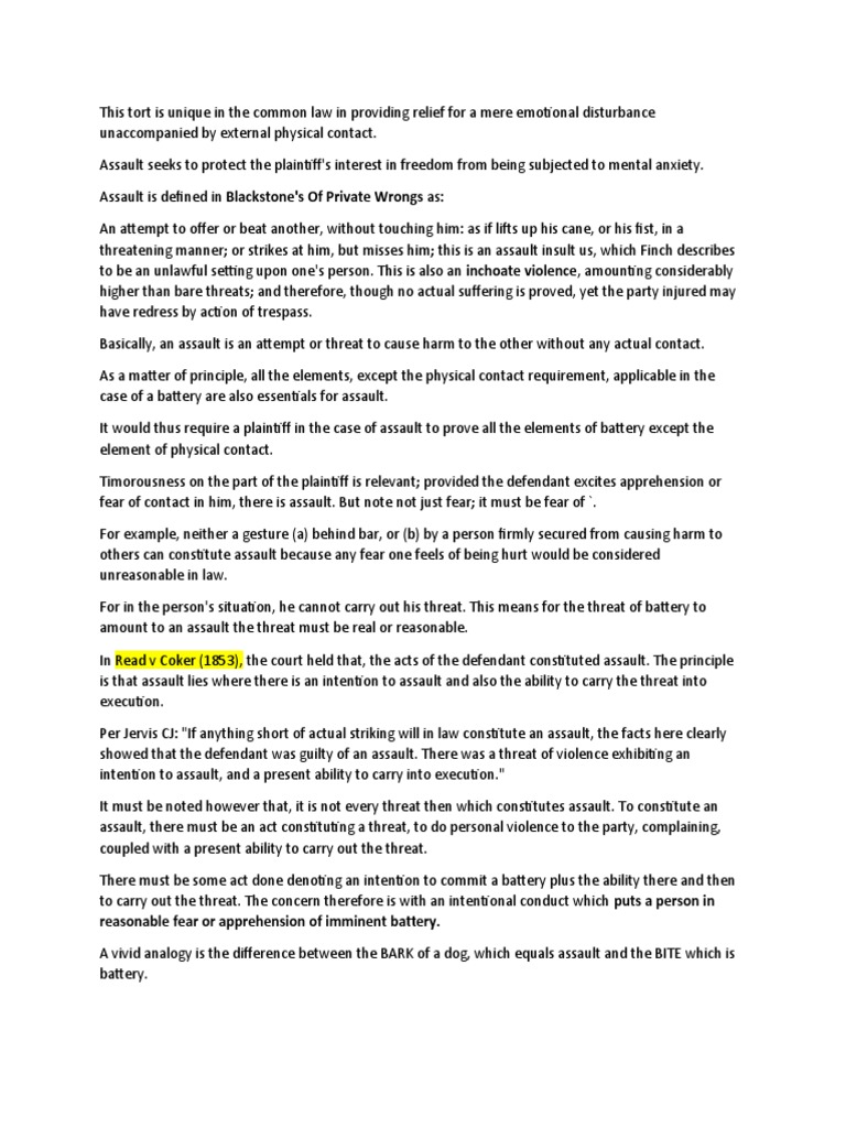 Assault and battery outline TITLE: TORT LAW OUTLINE TOPIC: 2 ASSAULT