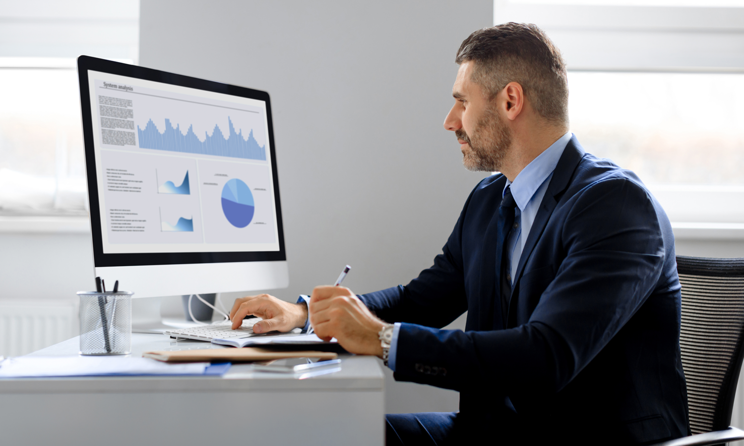 Confident Young Analyst Examining Financial Data and Charts on Multiple
