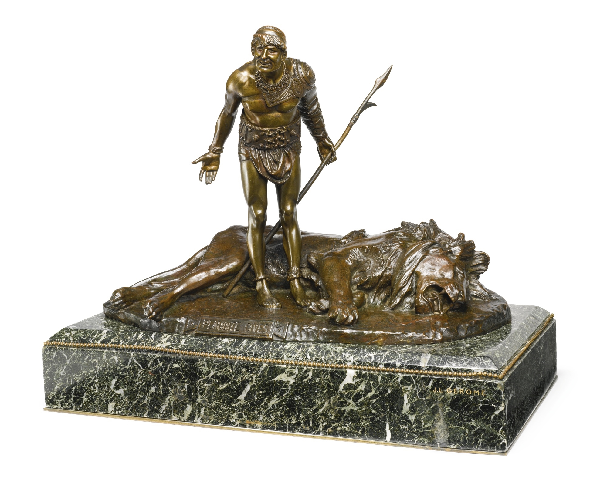 Bonhams : A bronze figural group of a warrior slaying a lion