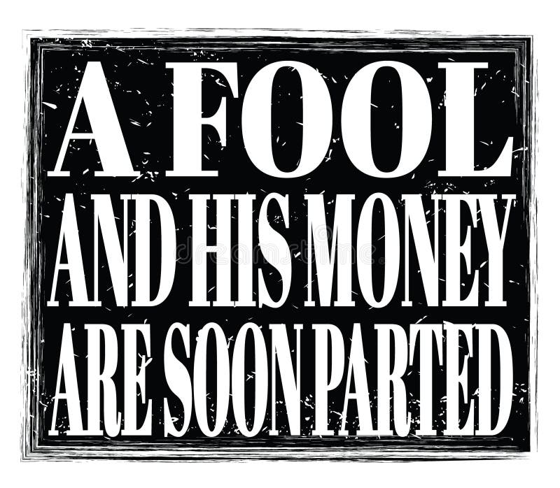 A FOOL and HIS MONEY are SOON PARTED Words on Black Stamp Sign Stock