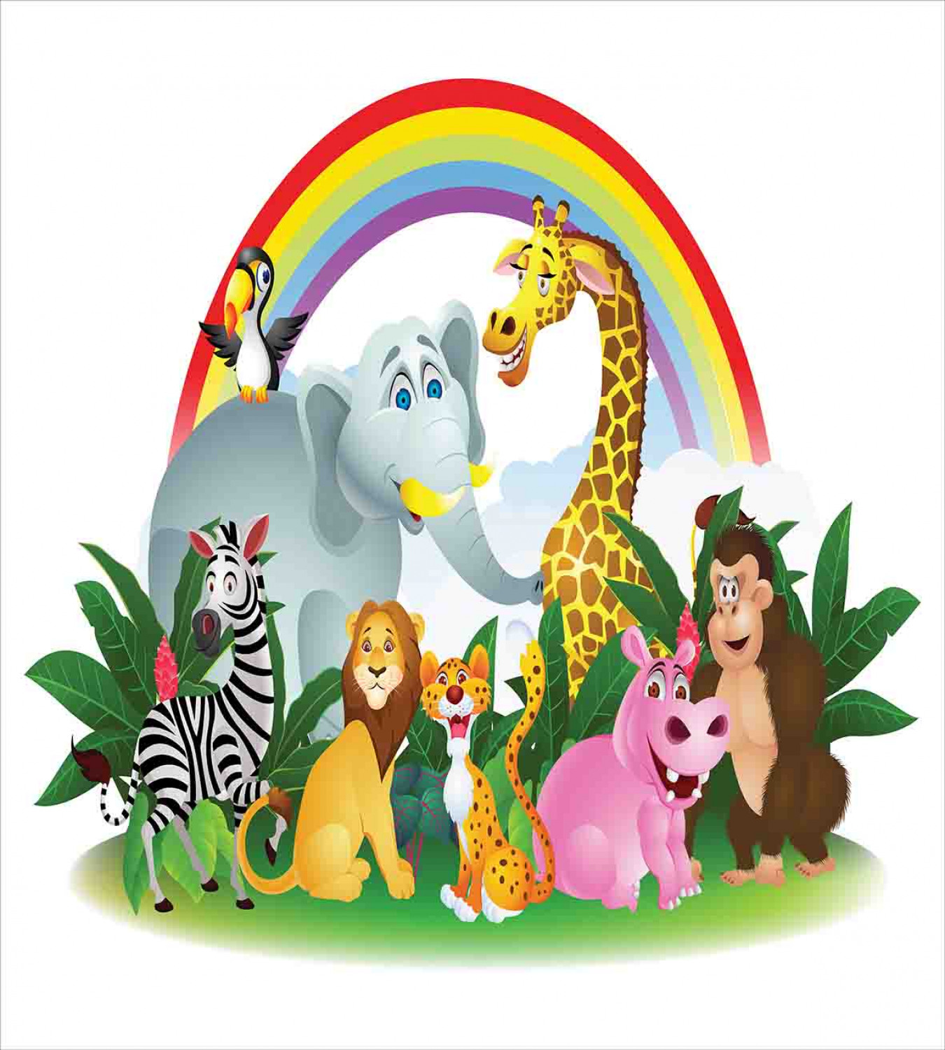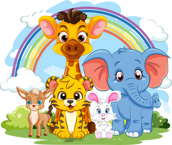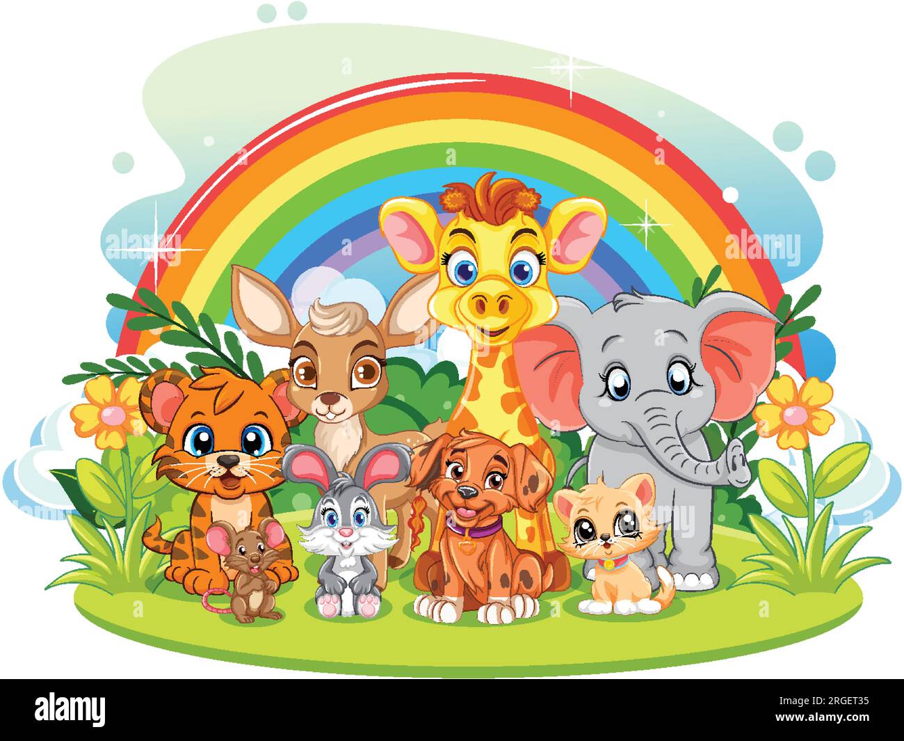Cartoon Wild Animals in the Field with Rainbow World Childrens Day