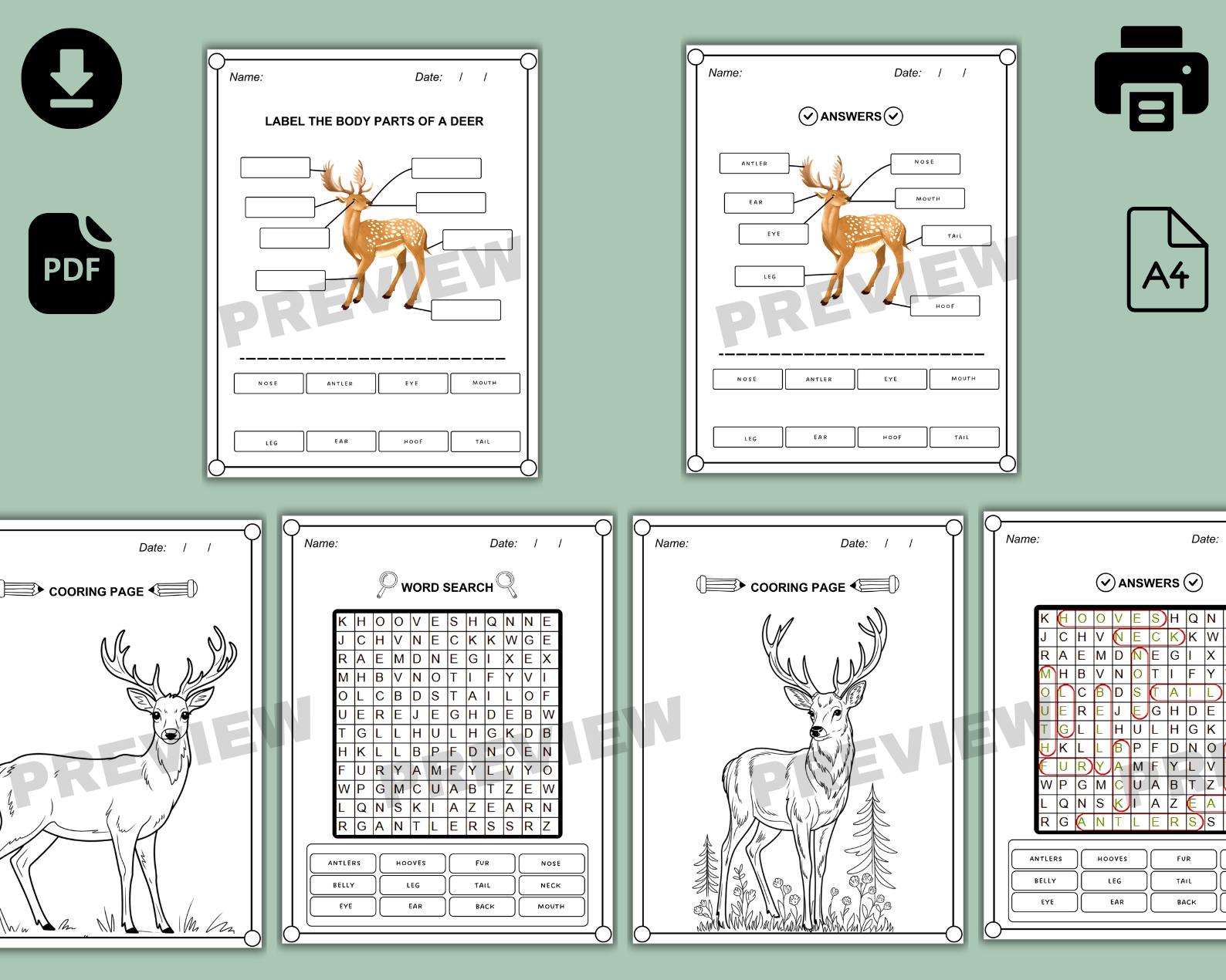 Deer Body Parts Labeling Coloring Word Search Wildlife Forest