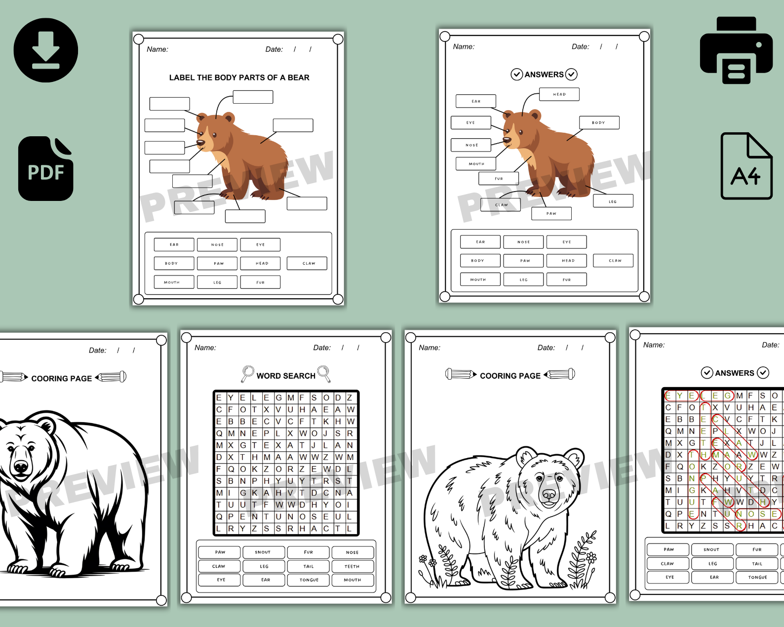Bear Body Parts Labeling Coloring Word Search Wildlife Forest