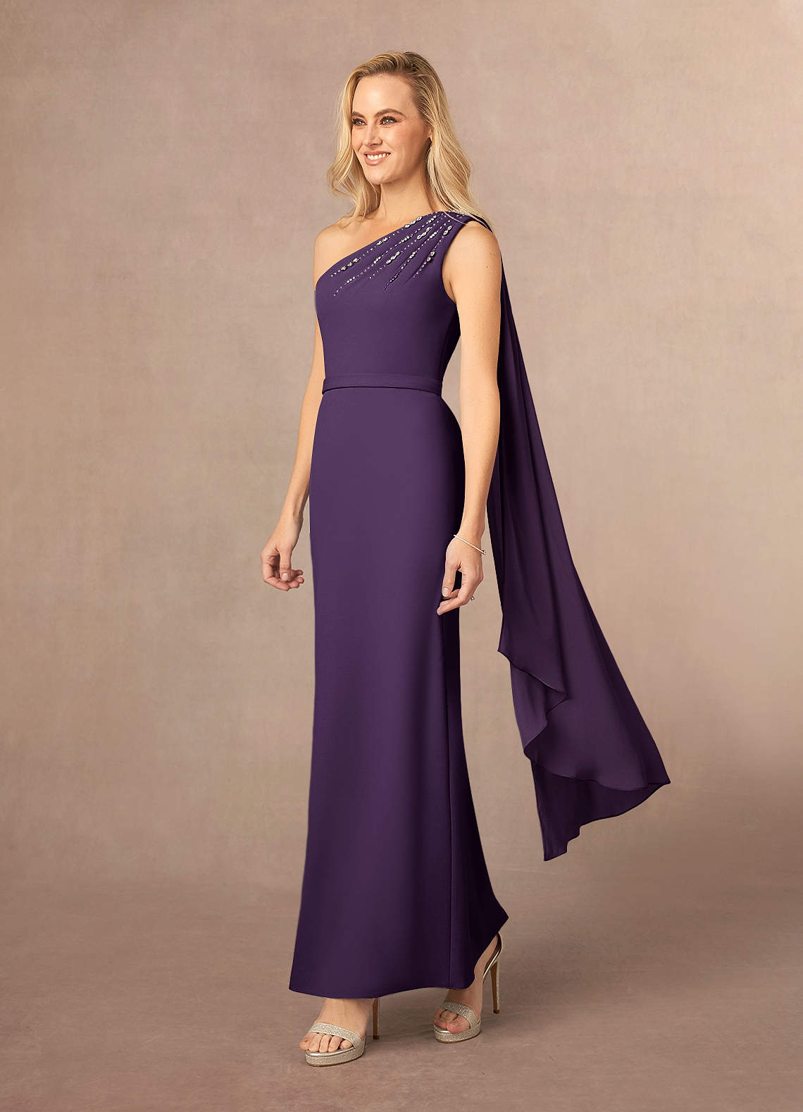 Plum Azazie Gianna Beaded Capelet One Shoulder Stretch Crepe Ankle