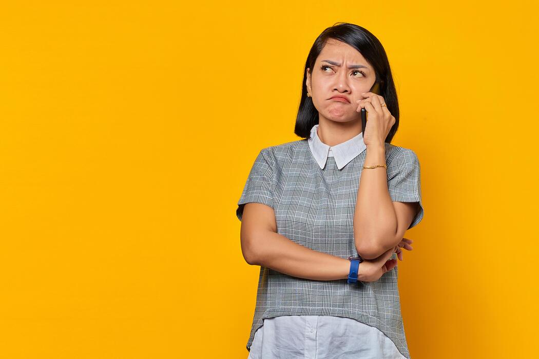Studio portrait of frowning annoyed angry and offended woman with arms