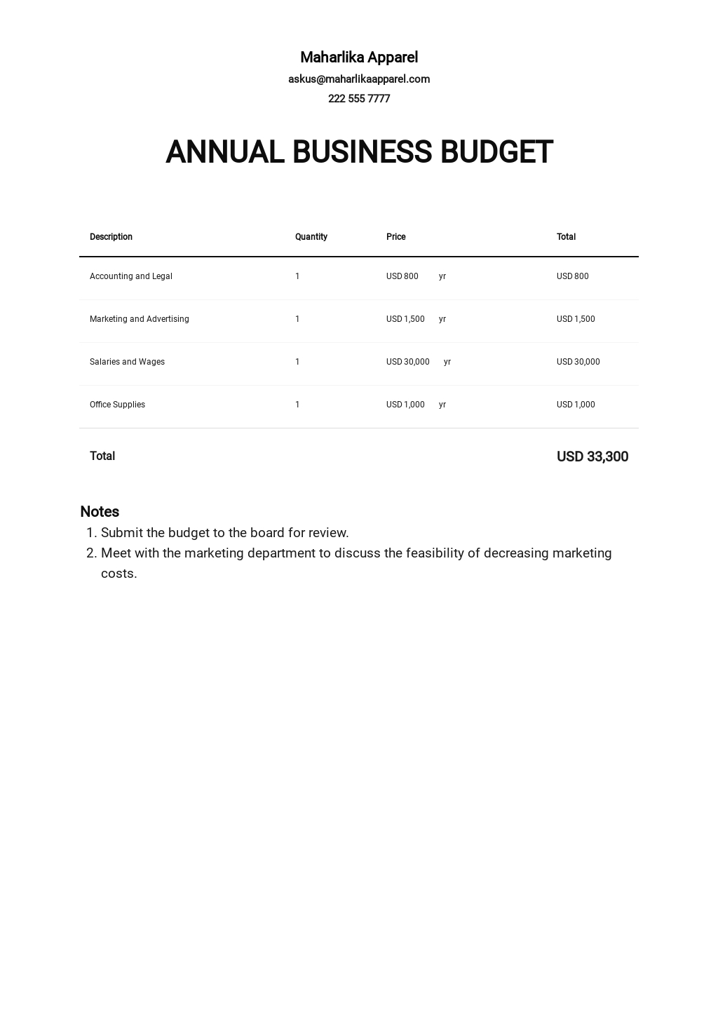 Annual Business Budget Template