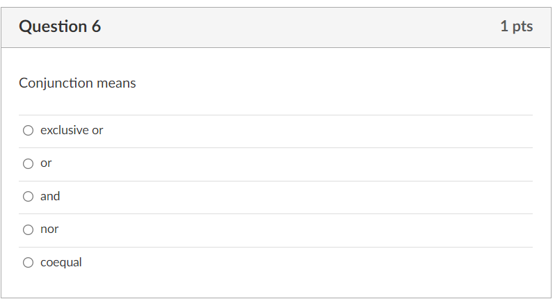 Solved Question 6 1 pts Conjunction means exclusive or or Chegg com