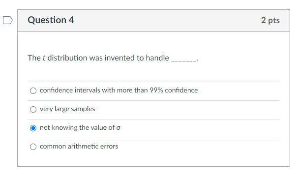 Solved Question 4 2 pts The t distribution was invented to Chegg com