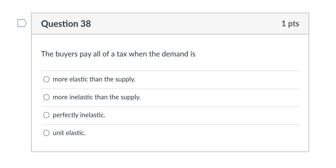 Solved Question 38 1 pts The buyers pay all of a tax when Chegg com