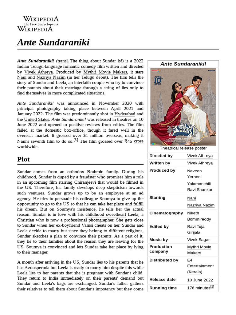Ante Sundaraniki Movie 2022 Cast Plot Release