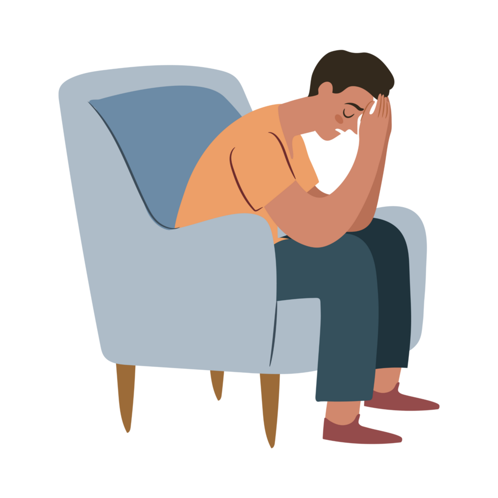 Anxious stressed man sitting on a sofa with hands on his forehead