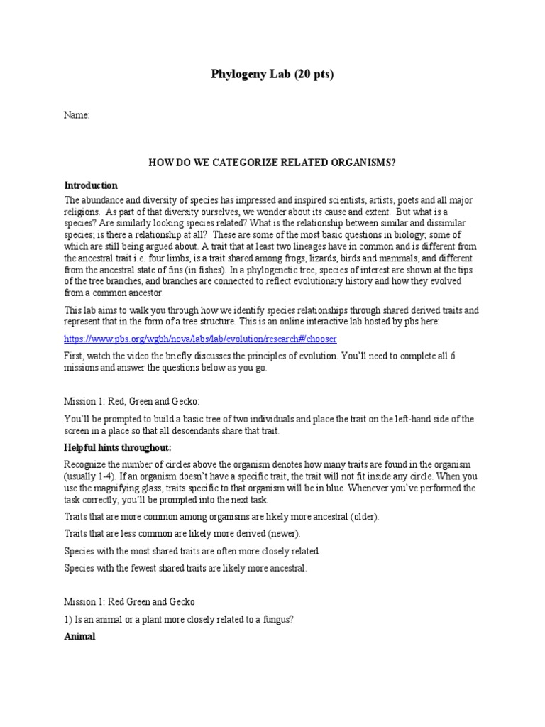 Phylogeny Lab Worksheet PDF Evolution Phylogenetic Tree
