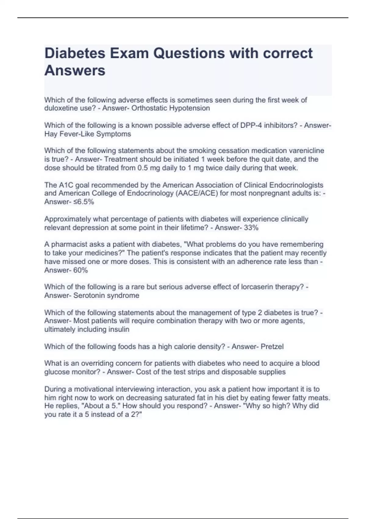 Diabetes Exam Questions with correct Answers APha Diabetes Stuvia US