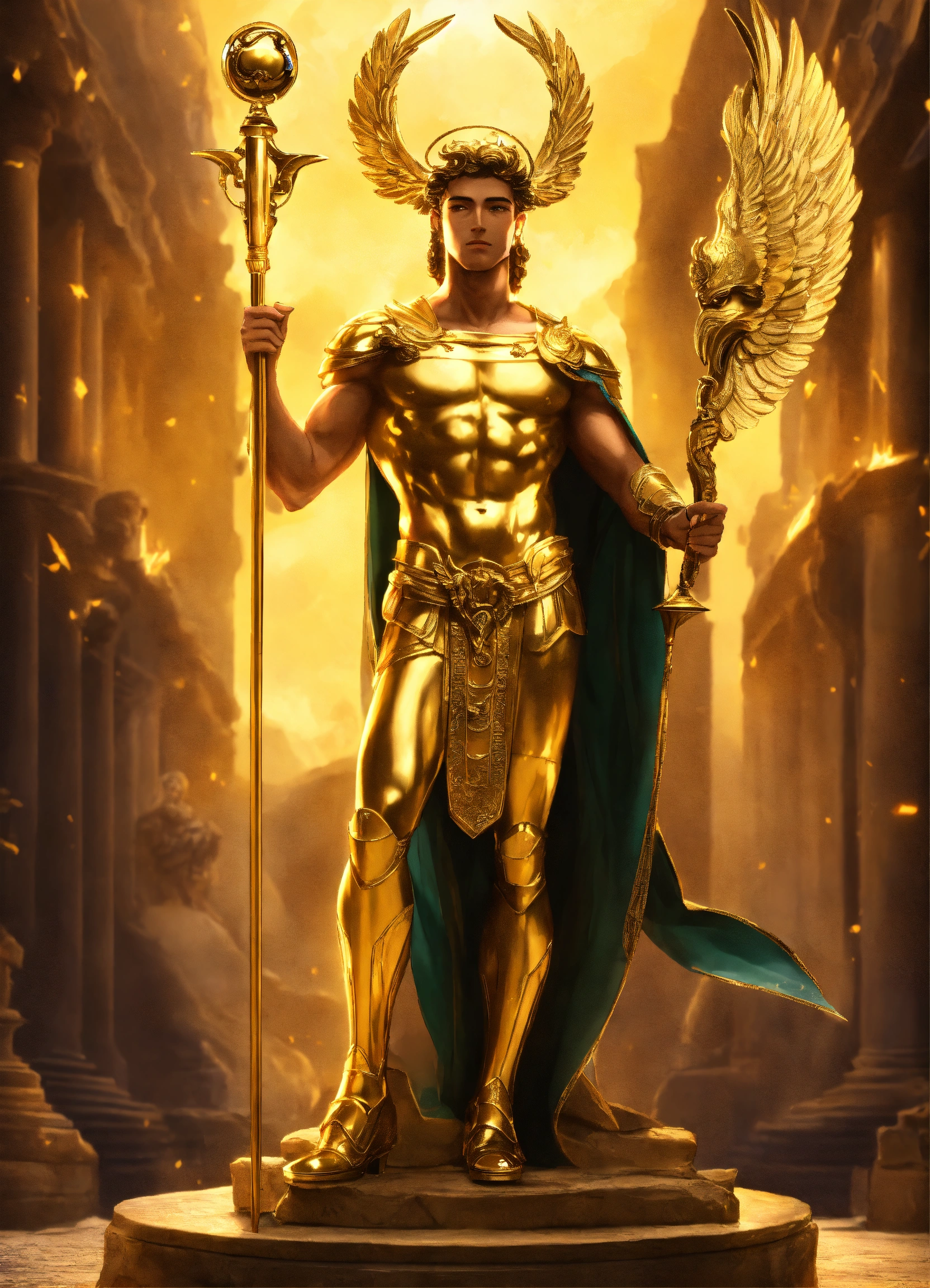 Lexica The god Hermes wearing golden armor and holding the staff of